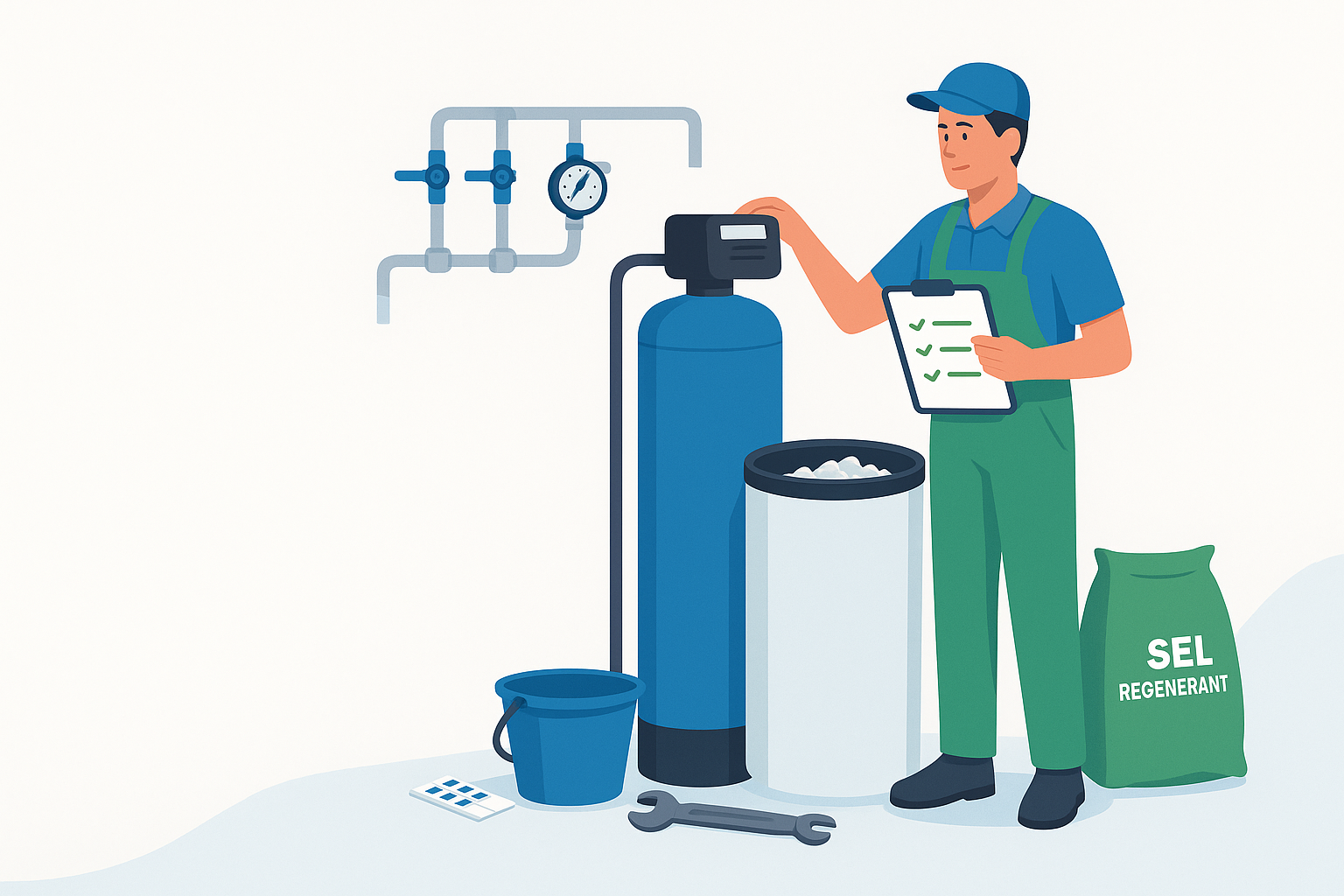 Un contrôle annuel est recommandé : test de dureté, désinfection, vérification de la vanne et du by-pass. Coût indicatif 90 à 150 €. Cet entretien assure performance et longévité.
